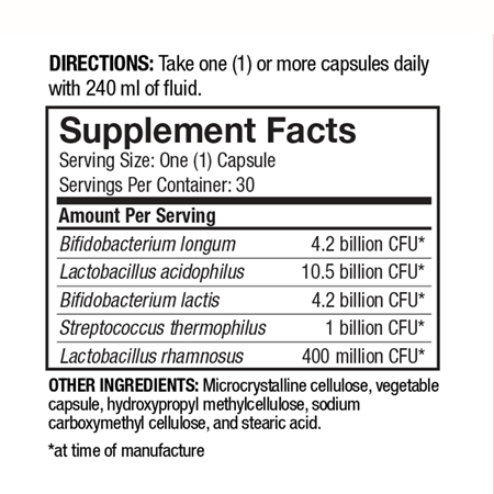 • Bifidobacterium longum, Lactobacillus acidophilus, Bifidobacterium lactis, Streptococcus thermophilus, and Lactobacillus rhamnosus.