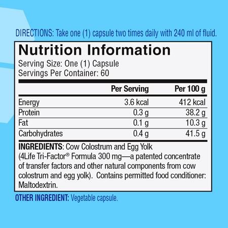 4Life Transfer Factor Tri-Factor Formula contains ingredients made by the immune system for the immune system. It represents a revolutionary advancement in 4Life Transfer Factor Science and raises the bar on the standard of immune system support with 4Life Tri-Factor Formula (made from cow colostrum and egg yolk). The exclusive Tri-Factor Formula educates, enhances, and balances the body’s immune system.